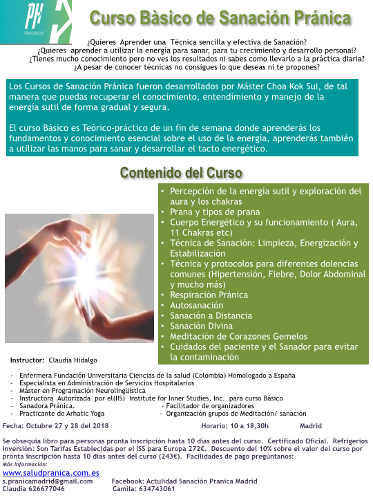 Curso Básico de Sanación Pránica en Madrid Por Mentor6 abril, 2018Fecha de inicio: 27 octubre, 2018Fecha de finalización: 28 octubre, 2018Hora: 12:00 am - 12:00 amLocalización: Madrid por confirmarMás información
